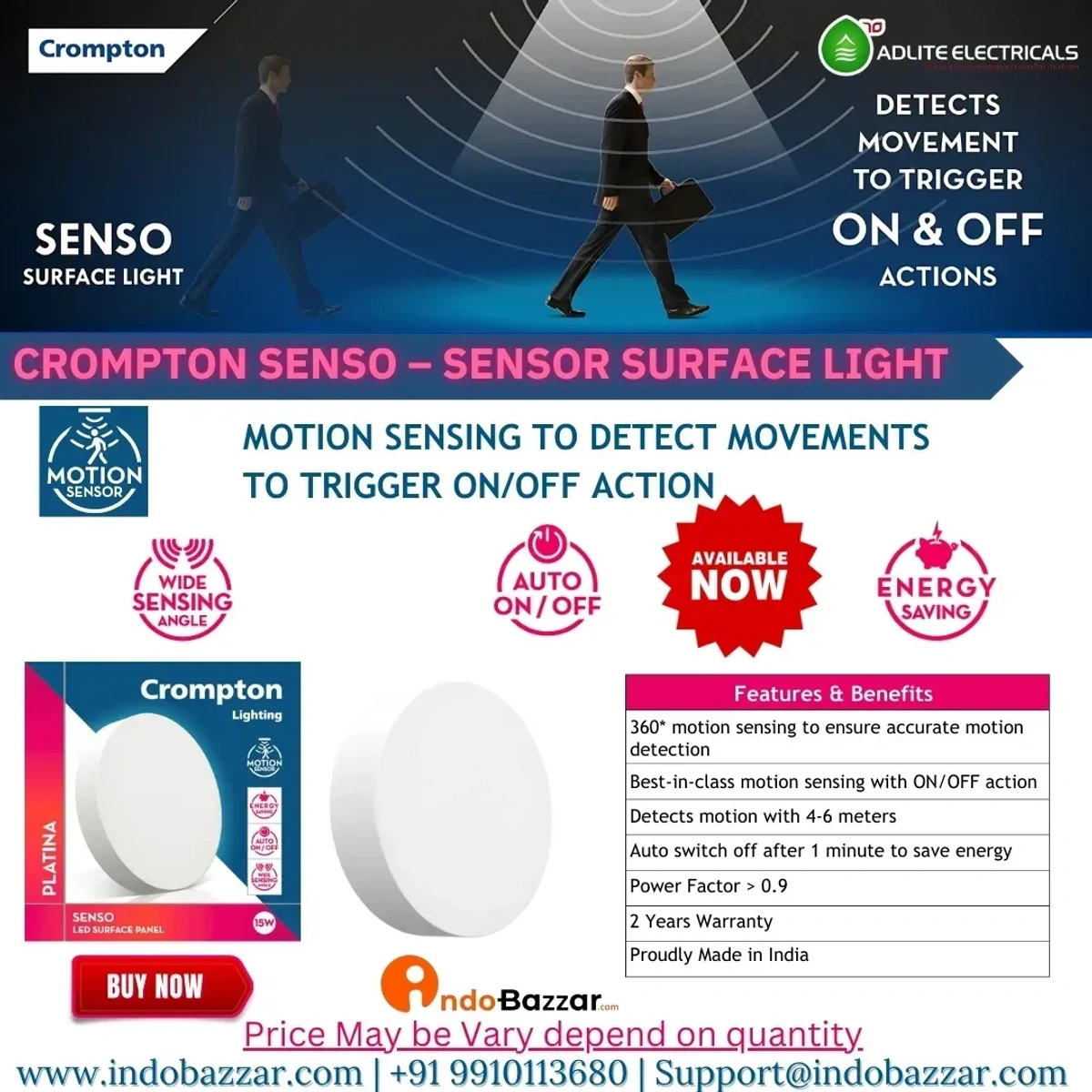 Brighten your space with the perfect blend of innovation and elegance! The Crompton Senso-Sensor 15W Surface Light, brought to you by Anjana Electrical, is designed to deliver exceptional lighting while enhancing the ambiance of your home or office. With its smart sensor technology and modern design, this surface light is a must-have for anyone seeking convenience, efficiency, and style.